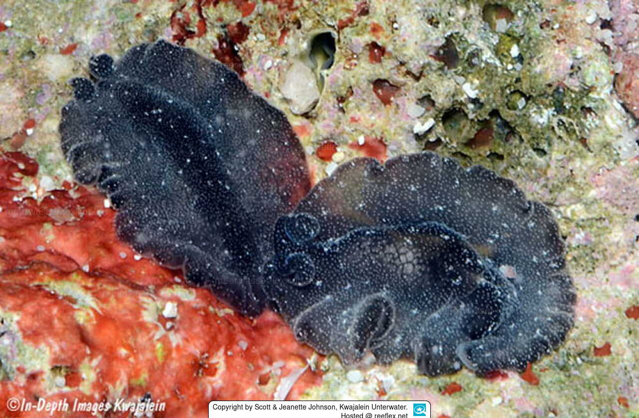Commonly known as The Starry flatworm, that looks like a starry night sky. . Usually with deep ruffles. Body pale brown to black with white speckles and dots forming clusters of various sizes. Body with a raised dark centre. The underside is light greyish-brown with white dots.