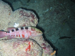 Cephalopholis sexmaculata, also known as Saddle grouper, ist found in the whole Indo-Pacific. The Saddle grouper shows a reddish background color, with some blue stripes and blotches on the snout, many purple-blueish spots on body and fins and five vertical bars on its body, among which can be seen six brown dorsal blotches.