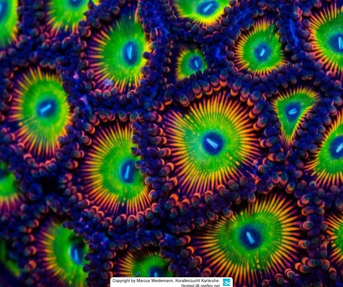 Apart from their colour and polyp size most Zoanthus species look very much alike, so they can hardly be identified exactly by mere physical appearance. Marine aquarists and coral traders have assigned telling names to the large variety of Zoanthus species referring to the special colouration morphology of the polyps to identify a particular specimen. Firstly, these fancy variety names are commonly used in the stocking lists of importers and coral shops, secondly, the majority of saltwater hobbyists are more familiar with them and thirdly, the reeflex entries will be easier to find via search engines. So that is why we have decided to list the different varieties of Zoanthid species under their common fancy names on reeflex.