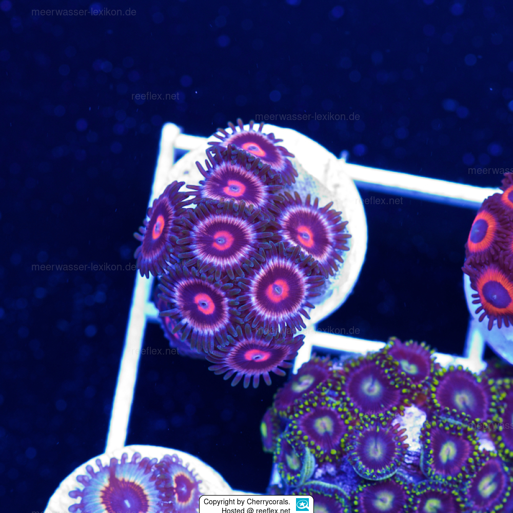 These beautiful Zoanthid or button polyps are sold as Zoanthus „Bombshells“ at Local fish Dealers and in online coral Shops. Many Thank to Cherrycorals for the wonderful Picutre.